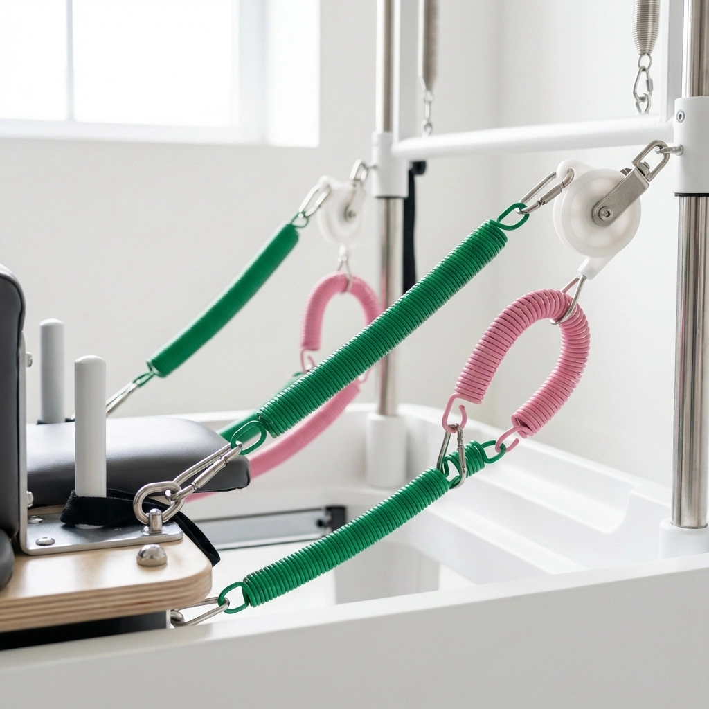 Here's where reformer Pilates gets really smart: those colorful springs aren't just for show. Each color typically represents a different tension level, allowing your instructor to customize your workout intensity. Heavier springs provide more resistance (making exercises more challenging), while lighter springs require more control and stability from your own muscles.